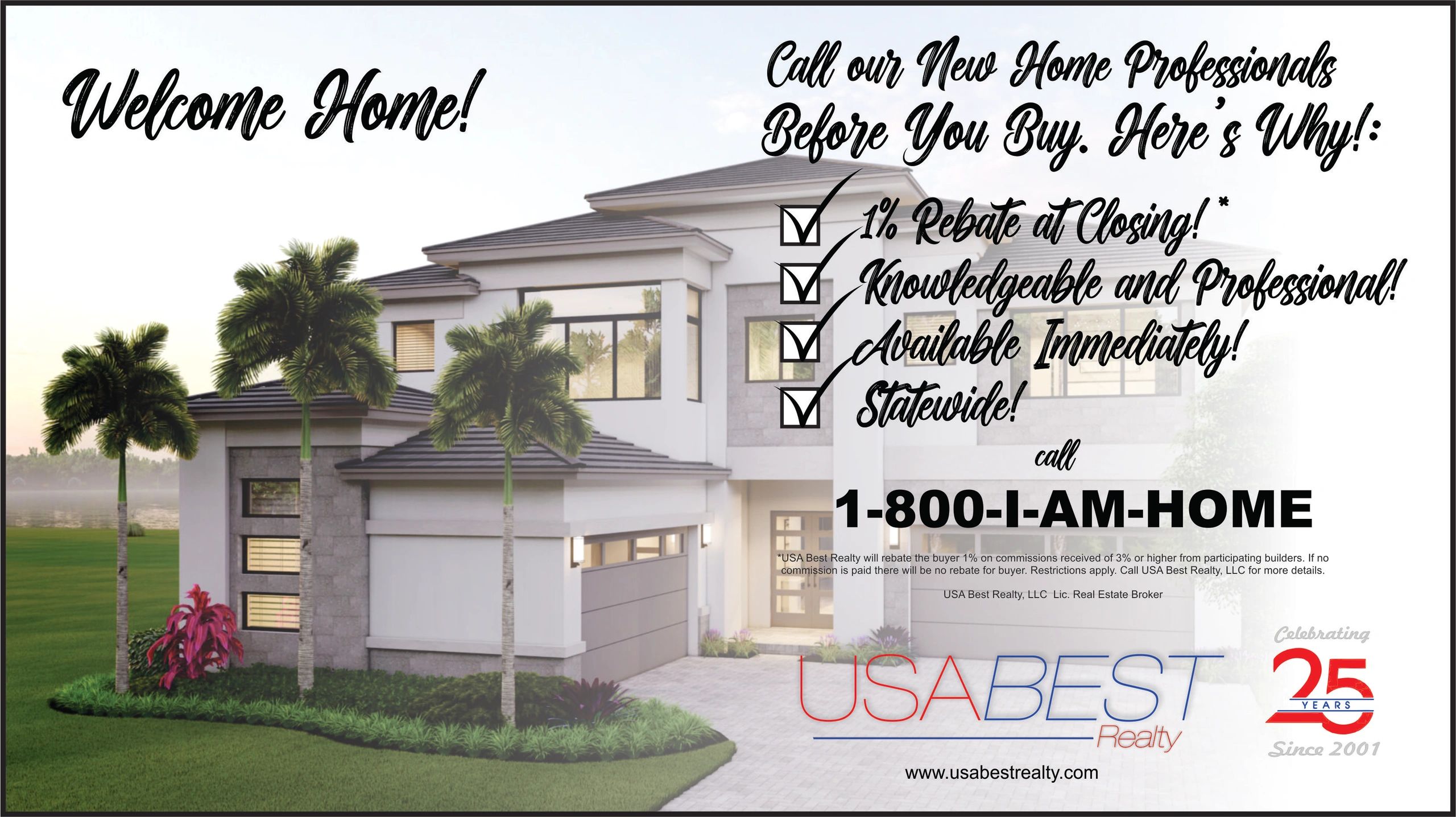 Thinking about purchasing a New Home? If you use our New Home Professionals at USA Best Realty to purchase your new construction home, we will rebate 1% back to you! It's that Simple! Use this rebate for furniture, appliances, closing costs or whatever suits you. It's our way of saying thanks and Welcome Home! At closing, we will rebate the buyer 1% on commissions received of 3% or higher from participating builders. For example, if you purchase a $500,000 home and we receive a 3% commission, $5,000 will be rebated back to you.This offer is statewide - throughout Florida! Call 1-800-I-AM-HOME (1-800-426-4663) to speak with one of our professionals now. Please note, If no commission is paid, there will be no rebate for buyer. Restrictions apply. Contact us for more details. USA Best Realty, LLC. Licensed Real Estate Broker