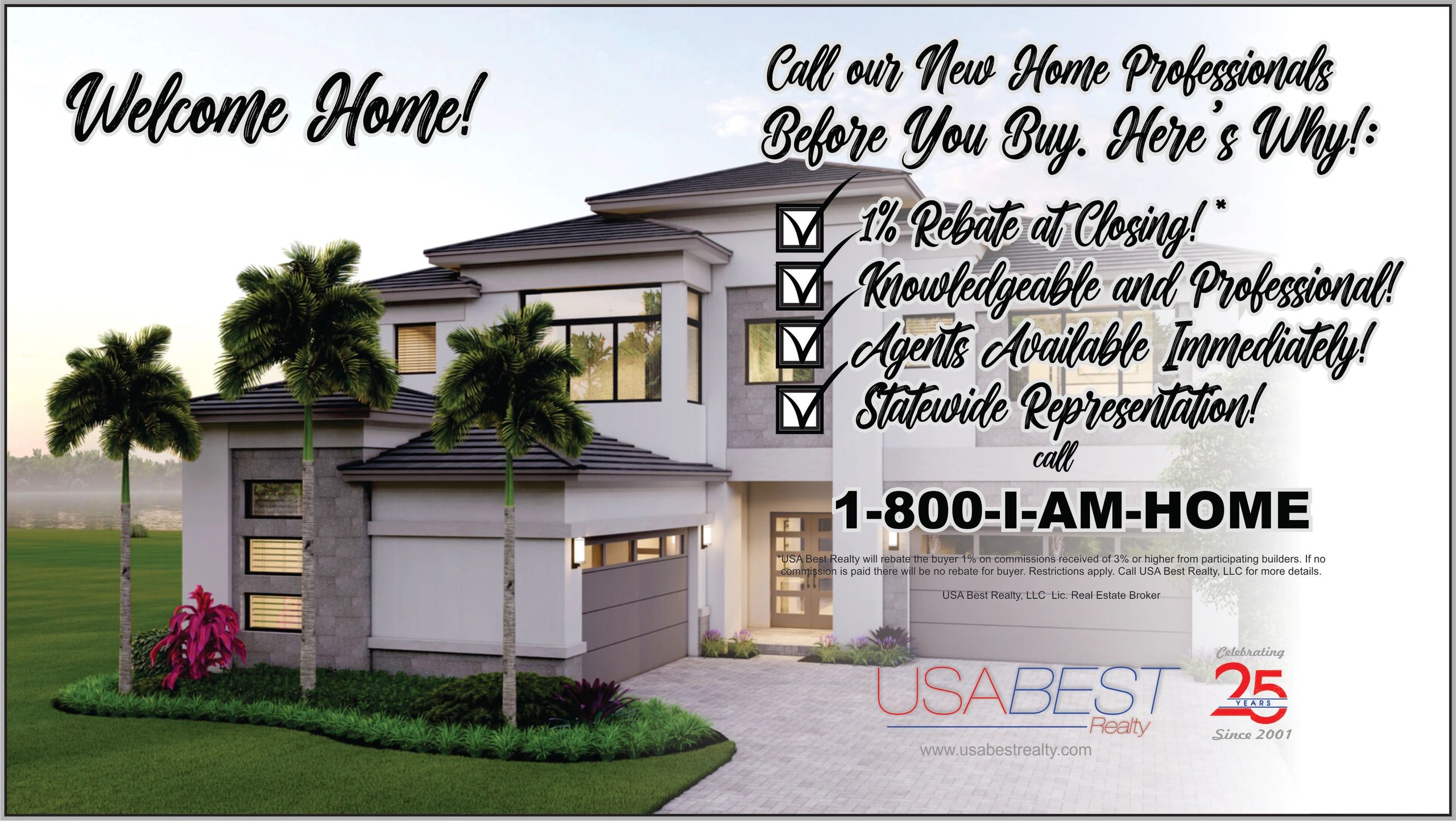 Thinking about purchasing a New Home? If you use our New Home Professionals at USA Best Realty to purchase your new construction home, we will rebate 1% back to you! It's that Simple! Use this rebate for furniture, appliances, closing costs or whatever suits you. It's our way of saying thanks and Welcome Home! At closing, we will rebate the buyer 1% on commissions received of 3% or higher from participating builders. For example, if you purchase a $500,000 home and we receive a 3% commission, $5,000 will be rebated back to you.This offer is statewide - throughout Florida! Call 1-800-I-AM-HOME (1-800-426-4663) to speak with one of our professionals now. Please note, If no commission is paid, there will be no rebate for buyer. Restrictions apply. Contact us for more details. USA Best Realty, LLC. Licensed Real Estate Broker